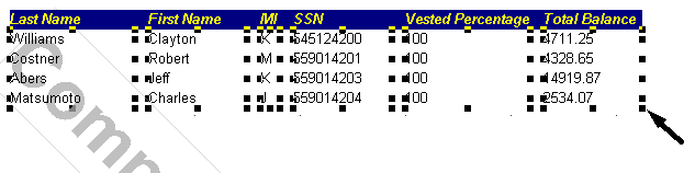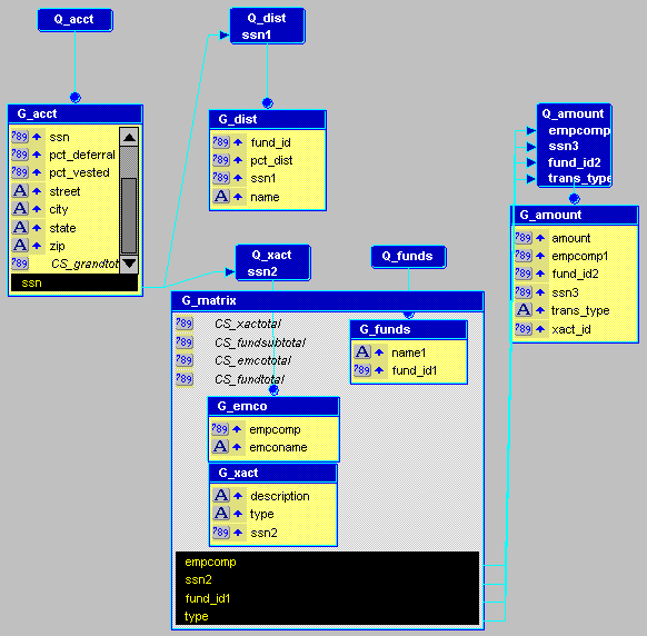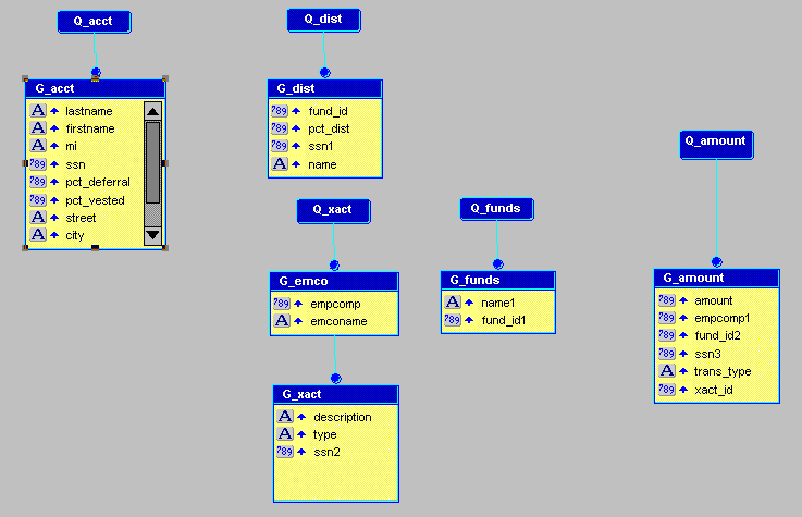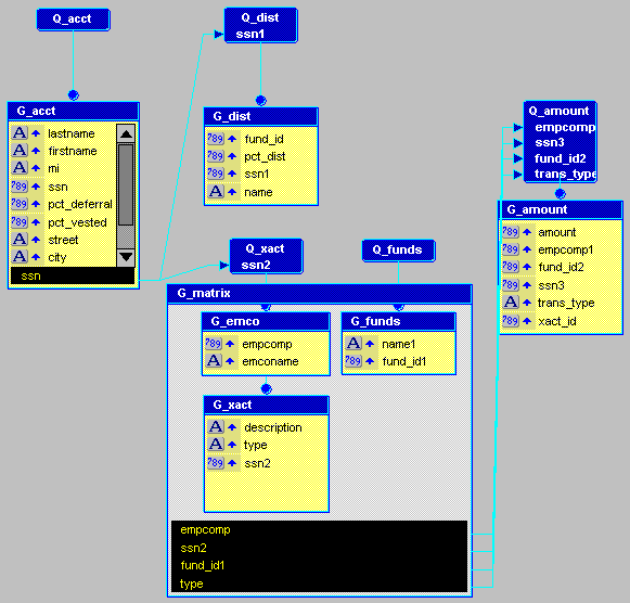 - Click column ssn in group G_acct and drag to column ssn1 in group G_dist. (This retrieves the percent distribution of investment fund elections.)