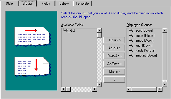 - On the Groups page, click G_acct from the Available Fields list box, then click Down.