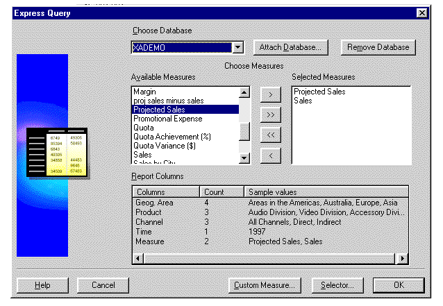 An example measure for a sales analysis might select data from dimensions for time, product, geographic division, and channel. With Express, you can create a query to report on information that is as broad (e.g., yearly direct and indirect sales for products sold everywhere) or as narrow (e.g., monthly direct sales for all televisions sold in California) as you like.