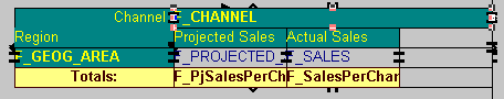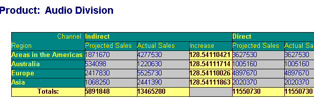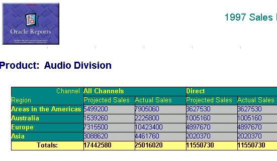 Notice the projected and actual sales. In the new report, each cell represents the yearly sales for a region and channel in a product division for 1997, while the previous report displays sales data for a region and channel in a product division for each month.