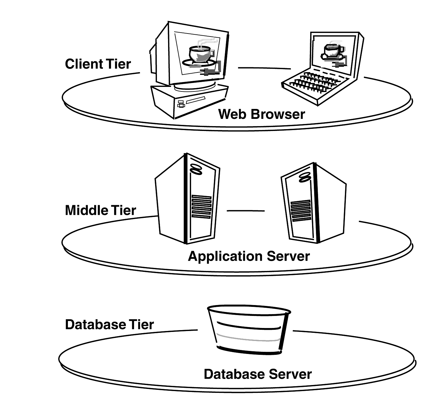 Forms Server uses a three-tier architecture to deploy database applications. Figure 2-1 shows the three tiers that make up the Forms Server architecture: