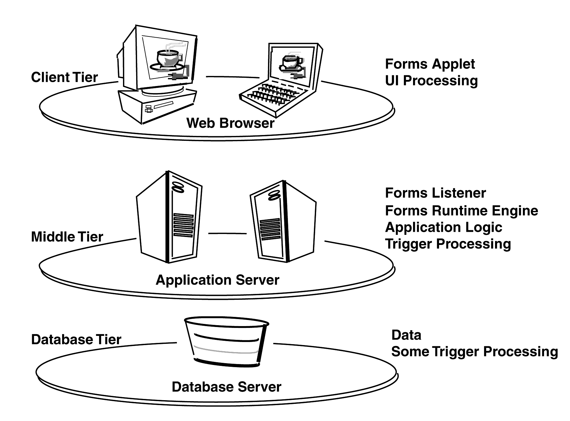 In a Web-based implementation, shown in Figure 8-2, the Forms Server Runtime Engine and all application logic are installed on application servers, and not on client machines. All trigger processing occurs on the database and application servers, while user interface processing occurs on the Forms client, located on users' machines.