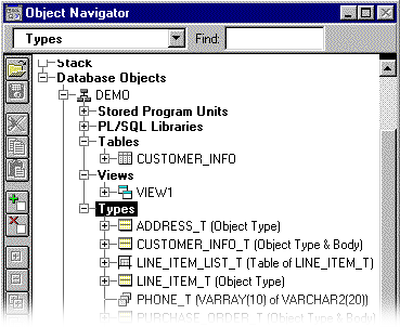 When you connect to an Oracle8 database server, a Types node under the Database Objects node enables you to display and find Oracle8 user-defined datatypes and their associated attributes and methods.