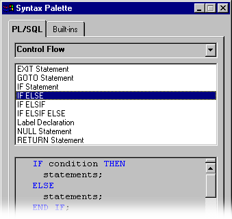 Unfamiliar with the syntax of PL/SQL? Use the Syntax Palette to display and copy PL/SQL constructs into the editor. The Syntax Palette also provides constructs from Developer built-in packages such as EXEC_SQL and DDE.