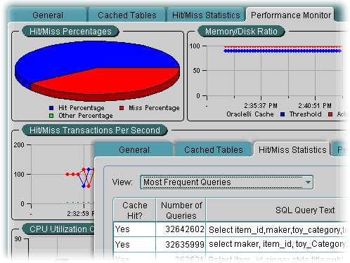 It provides additional statistics, such as the ratio of hits to misses, transactions per second, and the ratio of data accessed from memory to data accessed from disk. With the easy-to-use, Java-based management interface, you can evaluate whether you are caching the right data or need to cache more or different data. |
