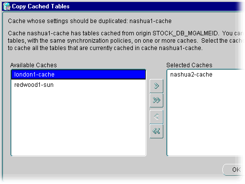 You select the cache you want to clone and choose Copy Cached Tables from the Object menu. In the Copy Cached Tables dialog box, you select the caches to which you want to copy the tables and other attributes. Oracle8i Cache adds the tables and synchronization policy information to the selected caches. Oracle8i Cache is now ready to use! |