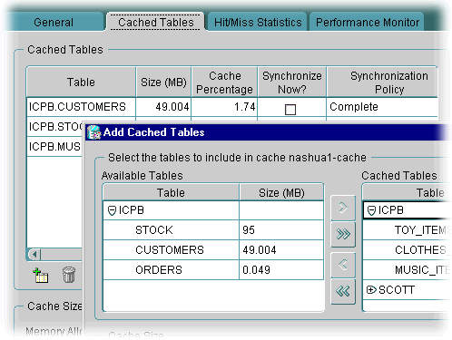Cache Manager makes it easy to adjust the data stored in the cache. You can add one or more tables from a cache by clicking the Add Cached Tables icon from the Cached Tables tab. You can remove one or more tables from a cache by clicking the Remove Cached Tables icon from the Cached Tables tab. Alternatively, you can remove tables from one or more caches by using the Remove Tables wizard. |