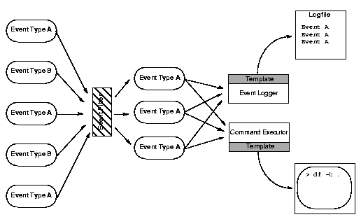 When the Event Handler starts, information from the filters are used to determine which events the Event Handler should select and pass on to the Event Logger and/or Command Executor adapters. Once the adapters receive the event, they further process the event based on the templates set up for the adapter. Templates provide a way to customize the behavior of the adapters. For the Event Logger, this means specifying which events should be logged. For the Command Executor, this means specifying the types of events it should respond to and the operating system command it should execute in response to that event.