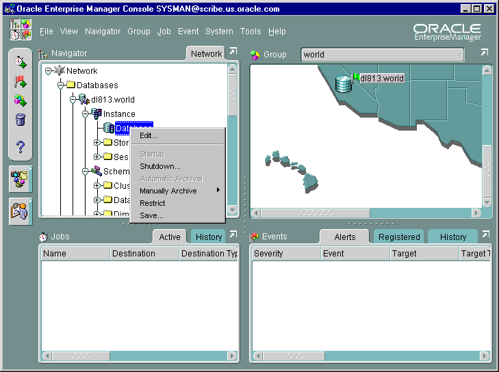 The Navigator interface provides easy manipulation of the services and objects in your managed network from the Enterprise Manager Console. From the Navigator, you can apply some or all functions available from the Console and any integrated applications to selected objects.