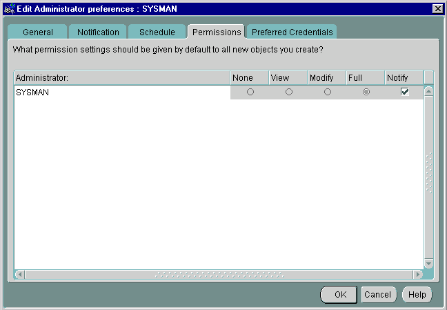Security parameters in Oracle Enterprise Manager are defined for services, objects, and administrators. All administrator accounts are defined by a Super Administrator who creates and defines the permissions of all the repository's administrators. A Super Administrator can access any object and control its security parameters, including objects owned by other administrators. Security parameters are set up in the Preferences dialog box, shown in Figure 1-3: