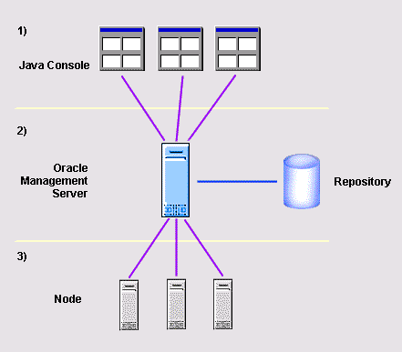Oracle Enterprise Manager has a three-tiered architecture. The first tier, the client, consists of a Java-based Console and integrated applications. The second tier is the Management Server or designated group of Management Servers which provides centralized intelligence and distributed control between clients and targets. The third tier is comprised of targets, such as databases, nodes, or other managed services. An Intelligent Agent resides on each target and monitors the services in the target for registered events (potential problem occurrences) and executes jobs sent by the Console via the Oracle Management Server(s).