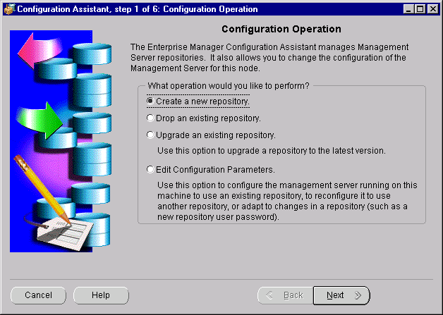 If you are a new Oracle Enterprise Manager user, or if you want to create a new Release 2.1 repository, you will use the Create a New Repository option of the Enterprise Manager Configuration Assistant to create and load your Release 2.1 repository and set up the configuration parameters for a local Management Server.