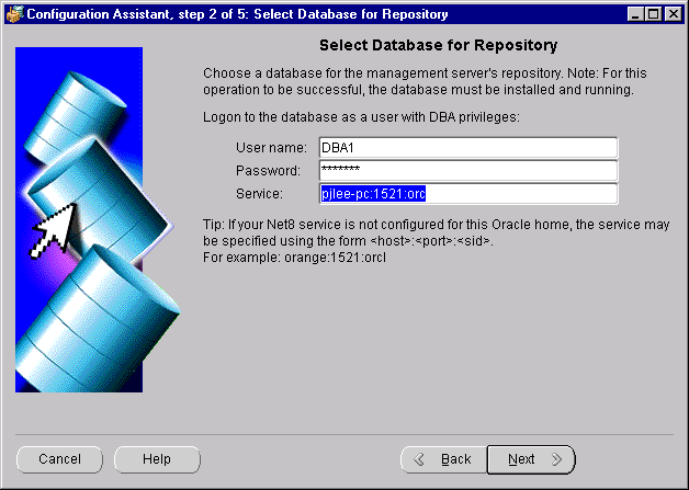 User name and Password: You must connect to the database as a user with DBA privileges. This is an individual database user account, not an Oracle Enterprise Manager administrator account.