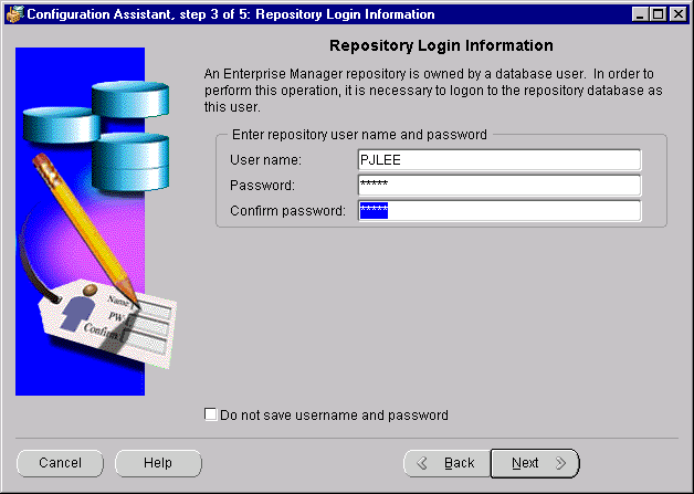 An Enterprise Manager repository is owned by a database user. During repository creation, a database user (repository schema user) who owns the repository will be created by the Enterprise Manager Configuration Assistant with the username and password you enter on this page.