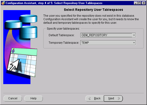 If the OEM_REPOSITORY tablespace does not exist, the following screen appears: