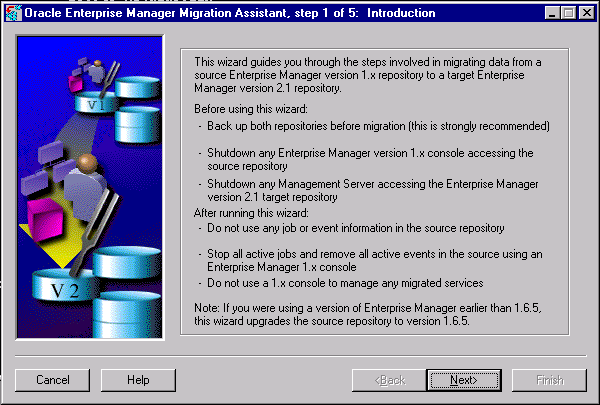 The Oracle Enterprise Manager Migration Assistant migrates Release 1.6.5 repositories to Release 2.1. If the Oracle Enterprise Manager Migration Assistant is run against a release earlier than 1.6.5, that repository is first upgraded to 1.6.5 in place, and then the upgraded repository is migrated to 2.1. Oracle Enterprise Manager Release 1.2 is the earliest version supported for in-place upgrades to version Release 1.6.5. If the target repository version is less than 1.6.5, then after the migration it is no longer functional with Oracle Enterprise Manager Release 1.x. Before beginning the migration of any repository, first back up the schema and/or tablespace.