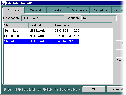 History page. When you view or edit a job from the Active Jobs or Job History pages, the dialog box includes a Progress page which shows when each task was completed, and whether or not it was successful. |
