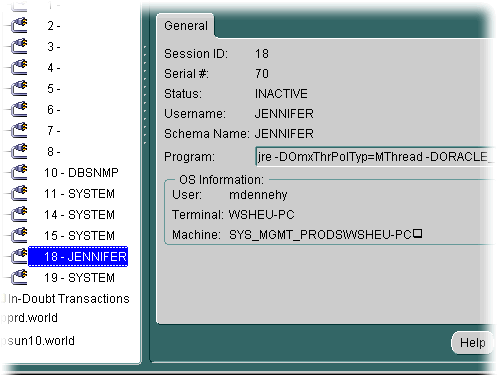 When I expand the development database to check its Sessions folder, I find that a developer is logged in.