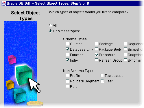 I start the DB Diff application and use it to compare the updated object definitions in the PO_ENTRY schema in the development database to the object definitions in the PO_ENTRY schema in the production database.