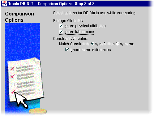 Before starting the comparison, I specify that DB Diff ignore physical attributes (such as INITIAL_STORAGE) and tablespaces in the comparison. This means that if corresponding definitions in the ORDER_ENTRY schemas in the two databases have different physical attributes (such as INITIAL_STORAGE values) or if the data for corresponding tables are stored in different tablespaces, DB Diff does not report these differences in the comparison results. |