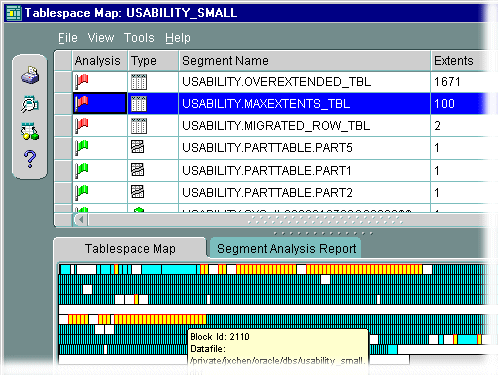 To fix this problem, I need to provide more room in the tablespace. Normally, I would add a datafile, but I know that the disks on this machine are already low on available space. I may be able to save enough space by defragmenting the tablespace. I'll then be able to mount a new drive and add new datafiles next week. To find out, I select the database in the Navigator, then expand Storage Management until I locate the OE tablespace, and launch the Tablespace Map. |