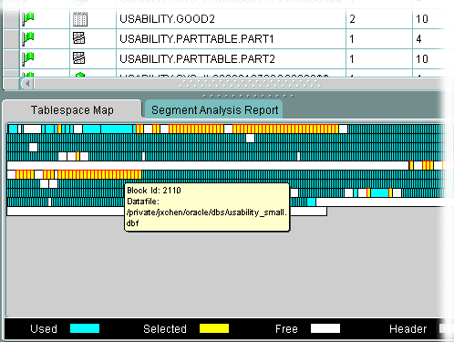 The Tablespace Map, a Tuning Pack application, allows me to view block and extent usage in the OE tablespace. The Tablespace Map and Segment Analysis Report make it easy to locate fragmented segments. I then launch the Reorg Wizard to defragment the problem segments. |