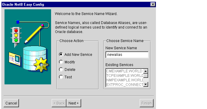 - A nonexistent TNS names alias in the previous window with the intention of using the Oracle Net8 Easy Configuration wizard to create a new TNS names alias using this name.
