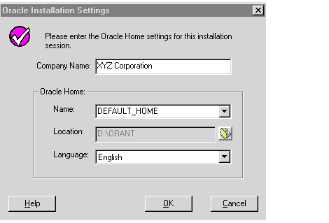 - In the Oracle Installation Settings window, type the information requested for each field, then click OK. If you have questions about any field in this window or any other installation window, click Help.