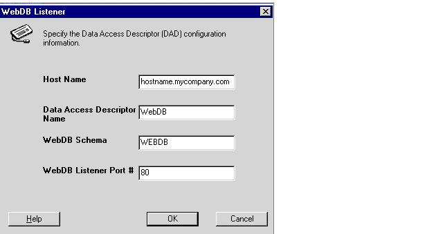 - The Host Name is the name of the machine on which the WebDB Listener will be installed. You can obtain the host name by typing hostname at a DOS command line prompt.