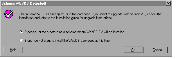 - Choose Stop, I do not want to install the WebDB packages at this time, then OK if you don't want to install WebDB into a different schema. Choosing this option stops installation.