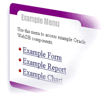Menus provide navigation through application components using pages of hypertext links. Security can be added by making menu items visible only to end users with specific roles. |