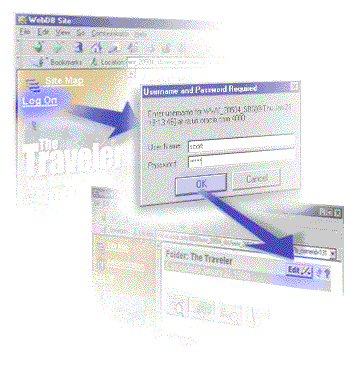 A WebDB site not only provides information to its users, but also includes all the tools needed to manage and maintain the site itself. When WebDB site users first display a site, they can only view public information. Users with a valid user name and password can log on to the site and view information that they have been explicitly granted access to view. In addition, if users have been granted the appropriate privileges, they can switch to Edit Mode and add new information to the site, or edit existing information. |