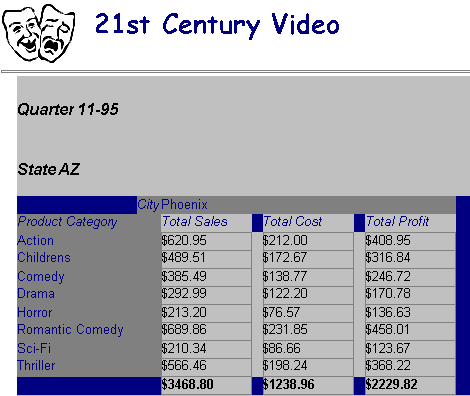 - a detailed Web report containing additional HTML pages, Web links, and Javascript that shows the sales and profit results from a video sales company.