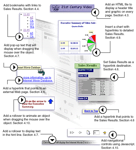 The following figure illustrates the various Web features that you will add to your Web report. Table 4-1, "Features demonstrated in this Web sample report", describes the steps you will take to enhance your report with these Web features.