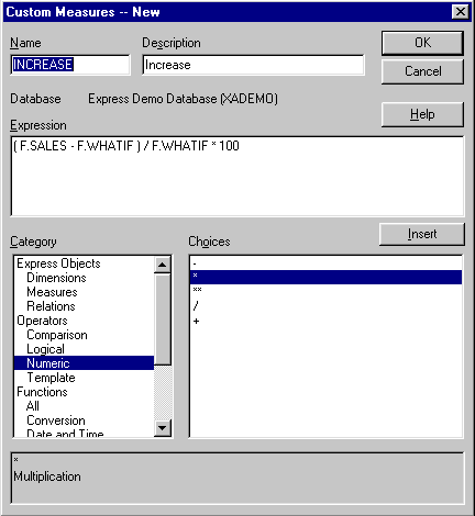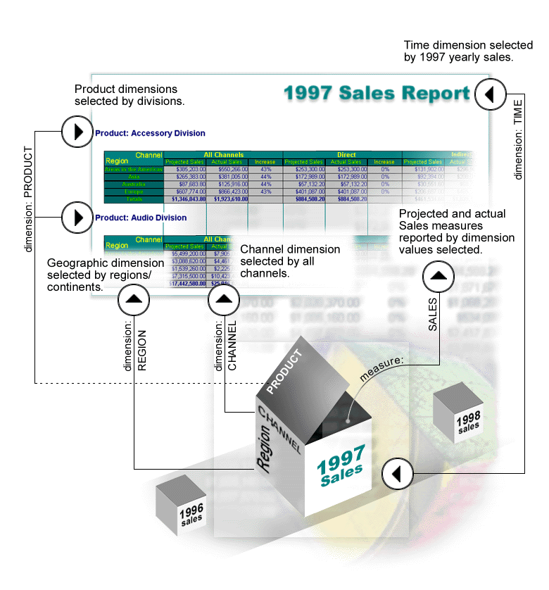An example measure for a sales analysis might select data from dimensions for time, product, geographic division, and channel. With Express, you can create a query to report on information that is as broad (e.g., yearly direct and indirect sales for products sold everywhere) or as narrow (e.g., monthly direct sales for all televisions sold in California) as you like.