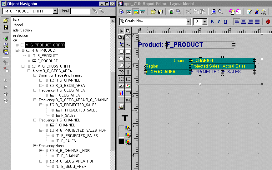 To understand why this error occurred, look for F_INCREASE in the Object Navigator. It is probably placed at a higher level (and lower frequency) than R_G_PROJECTED_SALES. Recall that the column INCREASE calculates the percent of actual sales above projected sales. In order to run this report, F_INCREASE must have the same frequency as F_PROJECTED_SALES and F_SALES to reference the data it needs to calculate the value.