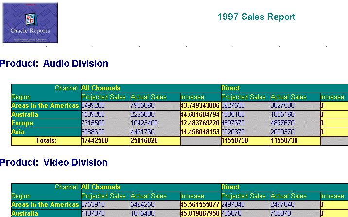 Notice the projected and actual sales. In the new report, each cell represents the yearly sales for a region and channel in a product division for 1997, while the previous report displays sales data for a region and channel in a product division for each month.