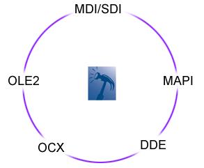 Forms Developer's 32-bit Windows support includes ActiveX (OCX) controls, multiple and single document interface (MDI and SDI), object linking and embedding with drag-and-drop (OLE2), the messaging API (MAPI), and dynamic data exchange (DDE).