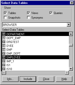 In this example, to retrieve a list of employee names, salaries, and department names, you would select the Employee and Department tables.