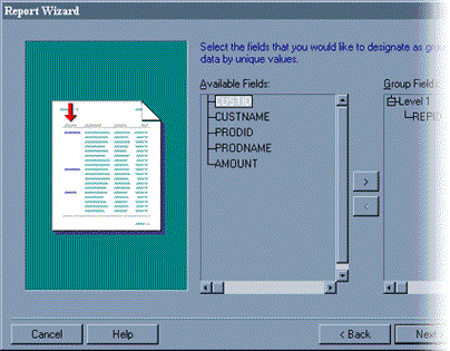 On the Fields tab, you select the PRODNAME field from the Available Fields list and add it to the Displayed Fields list.