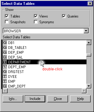 The Schema Builder Select Data Tables dialog box displays a scrollable list of database objects that are available in the active account and database.