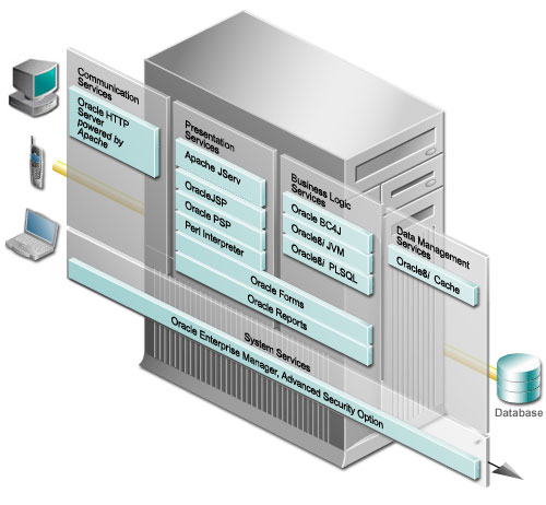 These services deliver dynamic content to client browsers, supporting servlets, JavaServer Pages, Perl/CGI scripts, PL/SQL Pages, forms, and business intelligence. Apache Jserv: a 100% pure Java servlet engine fully compliant with the Sun Microsystems Java Servlet APIs 2.0 specification. Apache JServ works on any version 1.1 compliant Java Virtual Machine and executes any Java servlet compliant with version 2.0. When the HTTP server receives a servlet request, it is routed to mod_jserv, which in turn forwards the request to the Apache JServ servlet engine. OracleJSP (JavaServer pages): a complete implementation of JavaServer Pages 1.1 as specified by Sun Microsystems, which extends Java Servlet technology, and supports the use of Java calls and scriptlets within HTML and XML pages; combines static template data with dynamic content to create user interfaces; supports component-based development, separating business logic (usually in JavaBeans) from the presentation. In addition, OracleJSP provides portability between servlet environments, support for SQLJ, OracleJSP Markup Language (JML), extended National Language Support (NLS), and extended datatypes to work around the limitations of Java primitive types and wrapper classes. Oracle PSP (PL/SQL Server Pages ): analogous to JavaServer Pages, but use PL/SQL rather than Java for the server-side scripting; includes the PSP Compiler and the PL/SQL Web Toolkit. Using this service, application developers can separate page format from application logic. Perl Interpreter: a persistent Perl runtime environment embedded in Oracle HTTP Server, saving the overhead of starting an external interpreter. When Oracle HTTP Server receives a Perl request, it is routed to mod_perl, which, in turn, routes the request to the Perl Interpreter for processing. These services support your application logic. Oracle BC4J (Business Components for Java): a 100%-Java, XML-powered framework that enables productive development, portable deployment, and flexible customization of multi-tier, database-enabled applications from reusable business components; applications can be deployed as either EJB Session Beans or CORBA Server Objects on iAS. Oracle8i JVM (Java Virtual Machine): a highly scalable, server-side Java platform supporting Enterprise JavaBeans (EJBs), CORBA, and database stored procedures; achieves high scalability through unique architectural design; common foundation for running Java and Java services in iAS and Oracle8i. Oracle8i PLSQL: a scalable engine for running business logic against data in Oracle8i Cache and the database; provides an environment that enables users to use browsers to invoke PL/SQL procedures stored in Oracle databases. Oracle Forms Services (Enterprise Edition only): enables users to run applications based on Oracle Forms technology over the Internet or corporate intranet to query or submit data to the database. Included in Enterprise Edition only. Oracle Reports Services (Enterprise Edition only): enables users to run dynamically generated reports built with Oracle Reports Developer on an internal company intranet, an external company extranet, or on the Internet to retrieve information from the database. To reduce the load on the back-end database instance, and to avoid network roundtrips for read-only data, iAS includes Oracle8i Cache. Oracle8i Cache (Enterprise Edition only): a data cache that resides on the middle tier, improves the performance and scalability of applications that access Oracle databases by caching frequently used data on the middle-tier machine; runs stateful servlets, JavaServer pages, Enterprise JavaBeans, and CORBA objects.