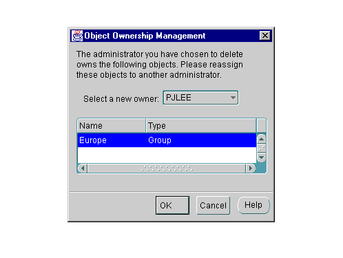 Every job, event, and group has an owner. When a Super Administrator deletes an administrator who owns some of these objects, the Super Administrator must reassign the items to another administrator.