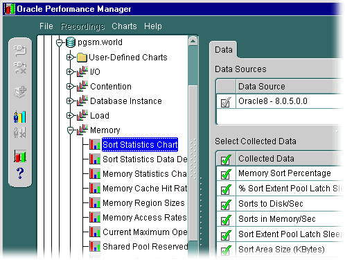 From the console, I highlight the pgsm production database instance and start Performance Manager. Everything looks fine from the overview graphical display, including hit ratios, memory sorts, and connected users.