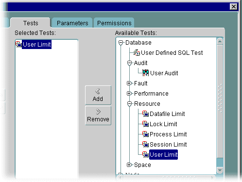 For example, the Database test User Limit is listed under the Resource category, along with other tests of database resource limits.