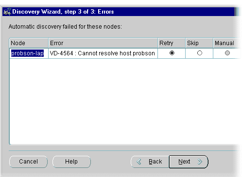 The new Discovery wizard steps you through discovery of target nodes with services that you need to administer. If discovery fails on some nodes, the wizard notifies you of the probable cause, so you can correct the problem, such as starting up an Intelligent Agent, or re-typing a node name, and retry the node in the same discovery session. |