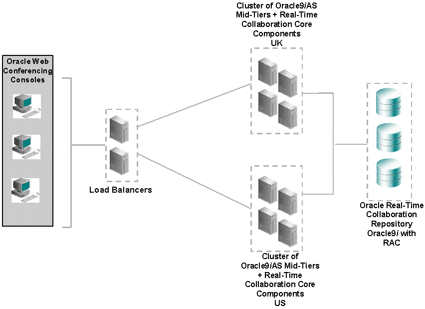 Leveraging the InstanceLocation property requires that geographically separated users are routed to Oracle Web Conferencing Application (OC4J_imeeting) in their respective areas. This can be accomplished automatically with a geographically enabled load balancer or manually by having users in different locations access different Web Conferencing URLs. The Oracle Web Conferencing Application (OC4J_imeeting) in an instance is the component that picks the Web Conferencing Server process for a conference. The Oracle Web Conferencing Application (OC4J_imeeting) knows the Web Conferencing Server process location and picks a Collaboration Server process in an instance which has the same value as its own location.