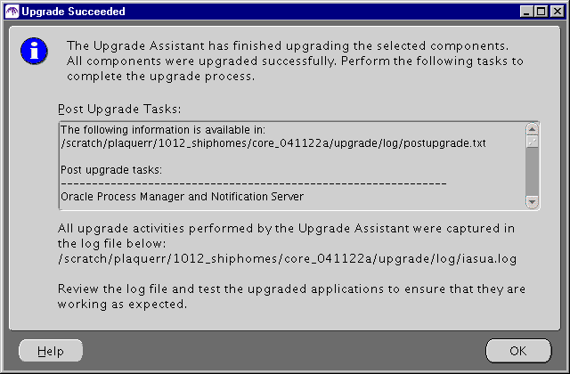 However, in some situations, the Upgrade Assistant displays a dialog box, which provides you with a list of the pre-upgrade requirements that are not performed automatically. These requirements must be met in order for the OracleAS Upgrade Assistant to successfully continue.