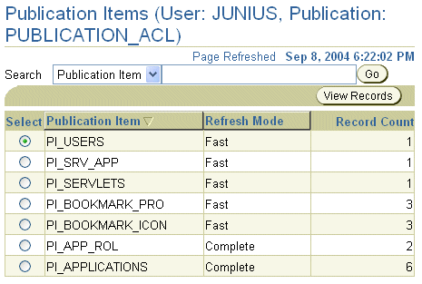 The Publications Items screen describes how many records is in the publication and whether it uses a fast or complete refresh mode.