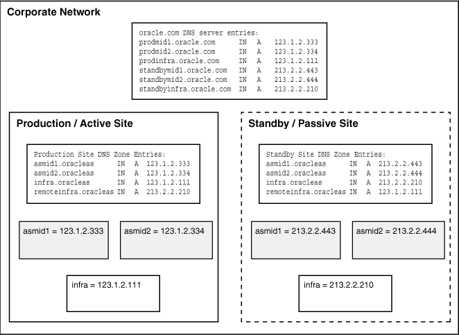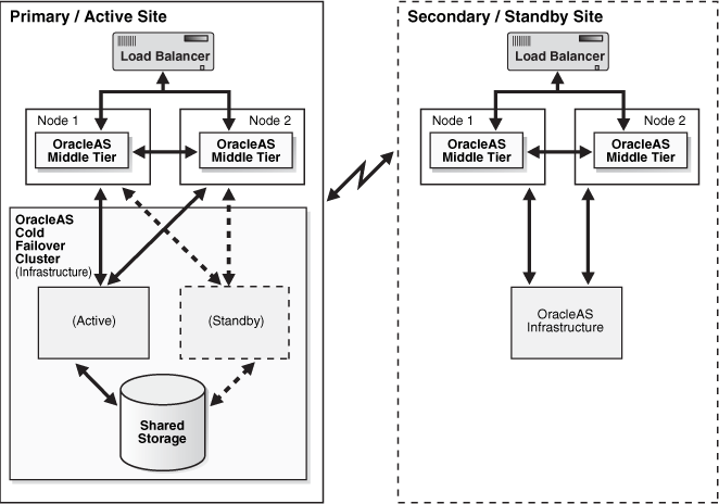 The Oracle Application Server Disaster Recovery solution consists of two configured sites - one primary (production/active) and one secondary (standby). Both sites may or may not have the following: same number of middle tiers and the same number of OracleAS Infrastructure nodes, and the same number of components installed. In other words, the installations on both sites, middle tier and OracleAS Infrastructure could be identical (symmetrical topology) or not identical (asymmetrical topology). Both sites are usually dispersed geographically, and if so, they are connected through a wide area network.